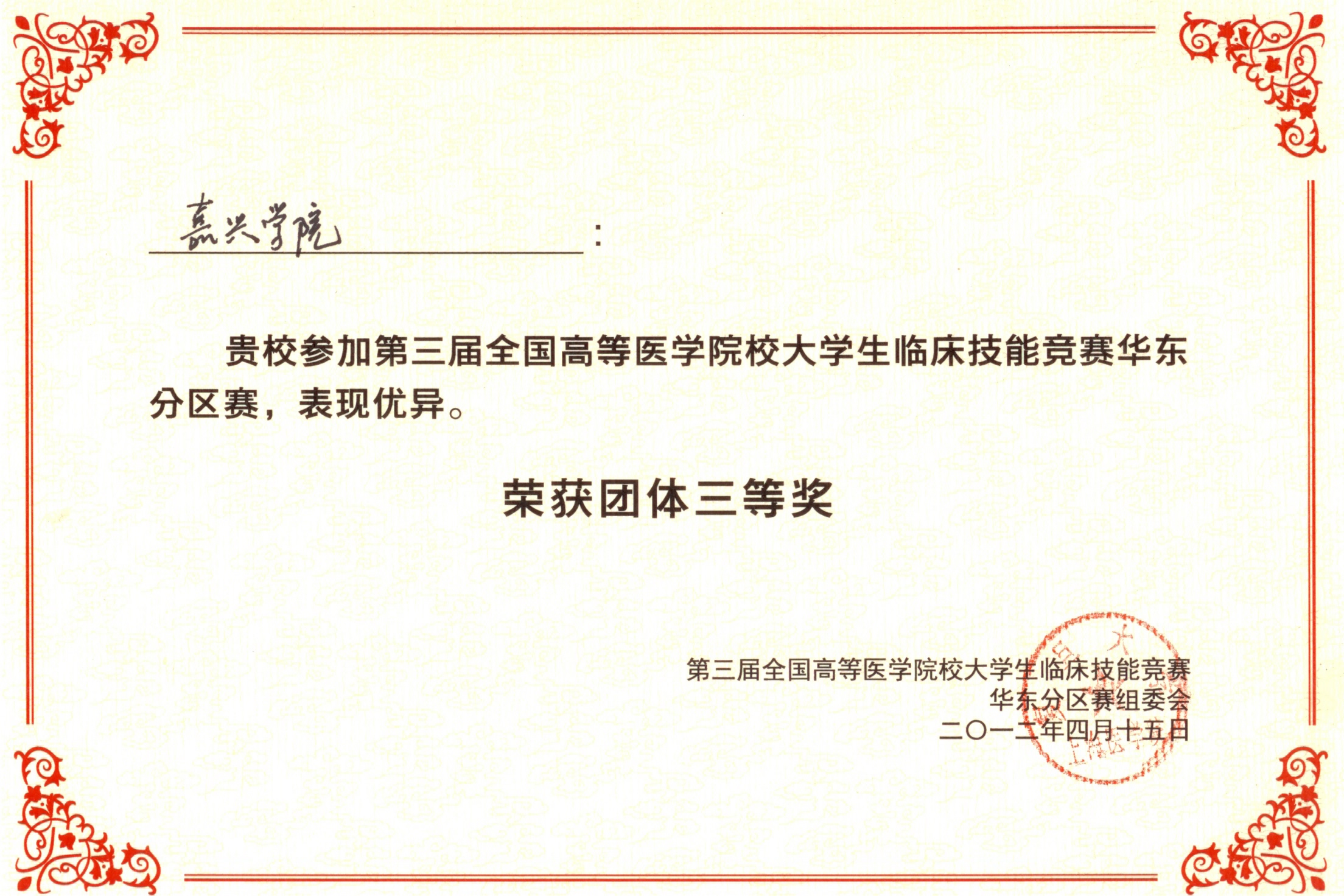 2012年4月14日至15日,由教育部高校司主办的第三届全国高等永利23411校大学生临床技能竞赛(华东赛区)在上海•复旦大学枫林校区举行,我校选派的07级临床医学专业学生顾超、李晓波、余俊华、陈幸四位同学参加了比赛,并最终在比赛中荣获团体三等奖。