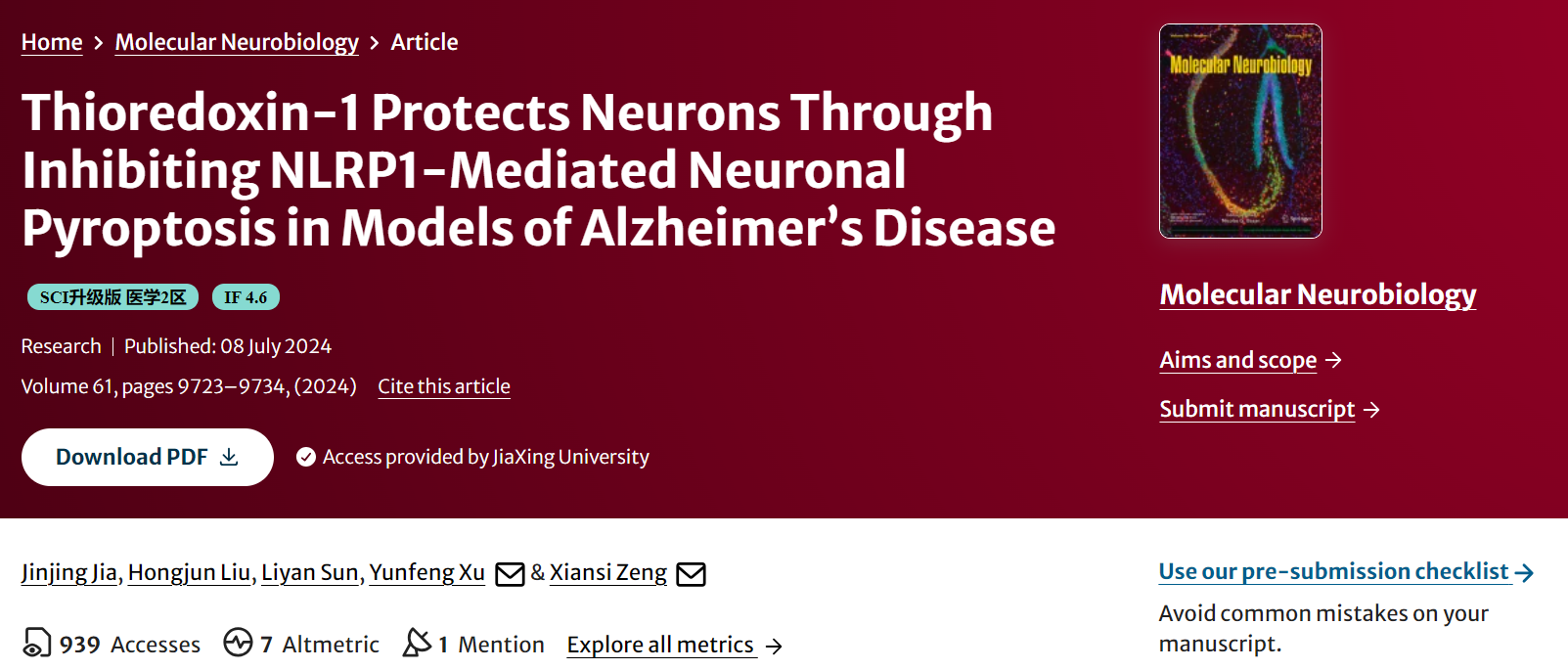 近日,永利23411神经生物学团队在JCR Q1区 、中科院二区期刊Molecular Neurobiology上发表题为:Thioredoxin‑1 Protects Neurons Through Inhibiting NLRP1‑Mediated Neuronal Pyroptosis in Models of Alzheimer’s Disease的原创研究论文。贾金婧副教授为本论文第一作者,曾宪思副教授为通讯作者,嘉兴大学为第一单位和通讯单位。