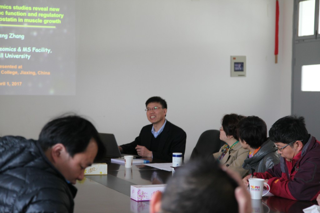4月1日上午,张博士为永利23411师生做了题为《Integrating multi-omics studies reveal new regulators of cardiac function and regulatory mechanisms of myostatin in muscle atrophy 》的学术报告,报告展示了目前世界最前沿的蛋白组学测试手段和质谱技术以及在医学等学科中的应用,并与在场师生进行了热烈的交流。报告具有很强的学科前沿性,在场师生开阔了视野,大家都认为受益匪浅。下午,张胜博士与永利23411的领导班子、研究团队、科研平台、实验中心等相关人员进行了座谈。座谈会上,陈健尔院长代表永利23411对张胜博士的来访指导表示诚挚的感谢,并指出 “十三五”期间永利23411要实现从教学型向教学研究型的转型,需要大力发展学科建设和提高的科研水平;期间需要建设高水平的科研平台,要组建科研团队和研究中心,保持科研可持续发展。希望张胜博士在研究团队、平台建设和人才培养等方面给予帮助和指导,希望两个院校可以进一步的合作。张胜博士表示自己所在的康奈尔大学的实验平台将积极帮助永利23411的科研平台建设和研究中心团队建设,并努力帮助建立康奈尔大学永利23411与嘉兴学院永利23411广泛、深入、长久的合作。期间,张胜博士还参观了永利23411医学实验中心和科研平台。