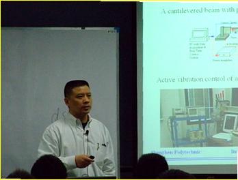 宋博士详细介绍了结构振动控制基本原理、经典控制理论、智能材料压电陶瓷的性能及其应用,并就明年3月份在美国举行的震动控制比赛事宜作了说明。他通过录像等多媒体形式让大家更为直观地了解了智能材料压电陶瓷和控制器的工作原理,并用Matlab编程进行现场演示,将大量的国际先进知识、理念和成果带给了我院师生。最后,我院师生就感兴趣的问题与宋博士进行了交流,提问十分踊跃。通过交流,大家及时了解了国际前沿研究成果。(机电工程学院党办)