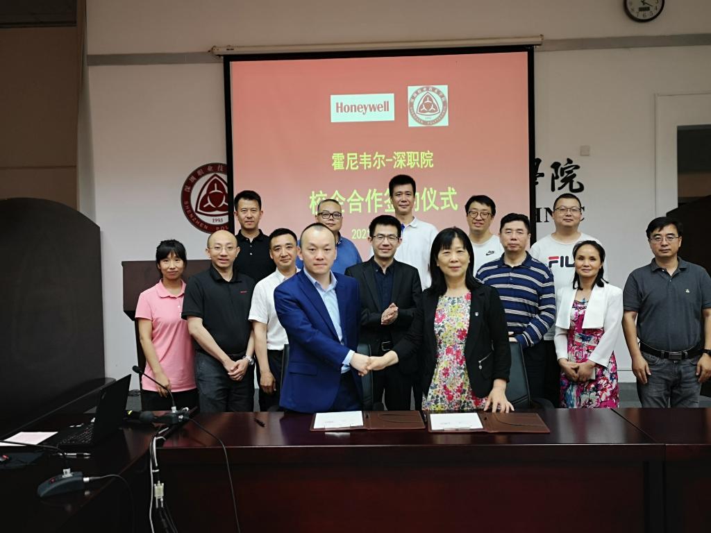 3月31日,机电学院与霍尼韦尔自动化控制(中国)有限公司在西丽湖校区图书馆东厅举行了校企合作签约暨揭牌仪式,共同培养建筑设备控制领域工程技术人才。霍尼韦尔智能建筑科技集团中国楼宇自控事业部总经理宫国刚、中国首席技术官刘海滨、中国楼宇自控南区销售总监詹兴来、中国楼宇自控技术支持经理郭东霞,深圳市维纳自控工程有限公司总经理王建;深圳鹏城技师学院智能技术学院副院长邱孝扬、楼宇教研室主任赵麟、专业老师赵子云;机电学院院长陈红、副院长郭树军、廖强华,建筑智能化工程技术专业主任侯志坚;参加仪式的还有建筑智能化工程技术专业教师和学生参加仪式。仪式由廖强华主持。