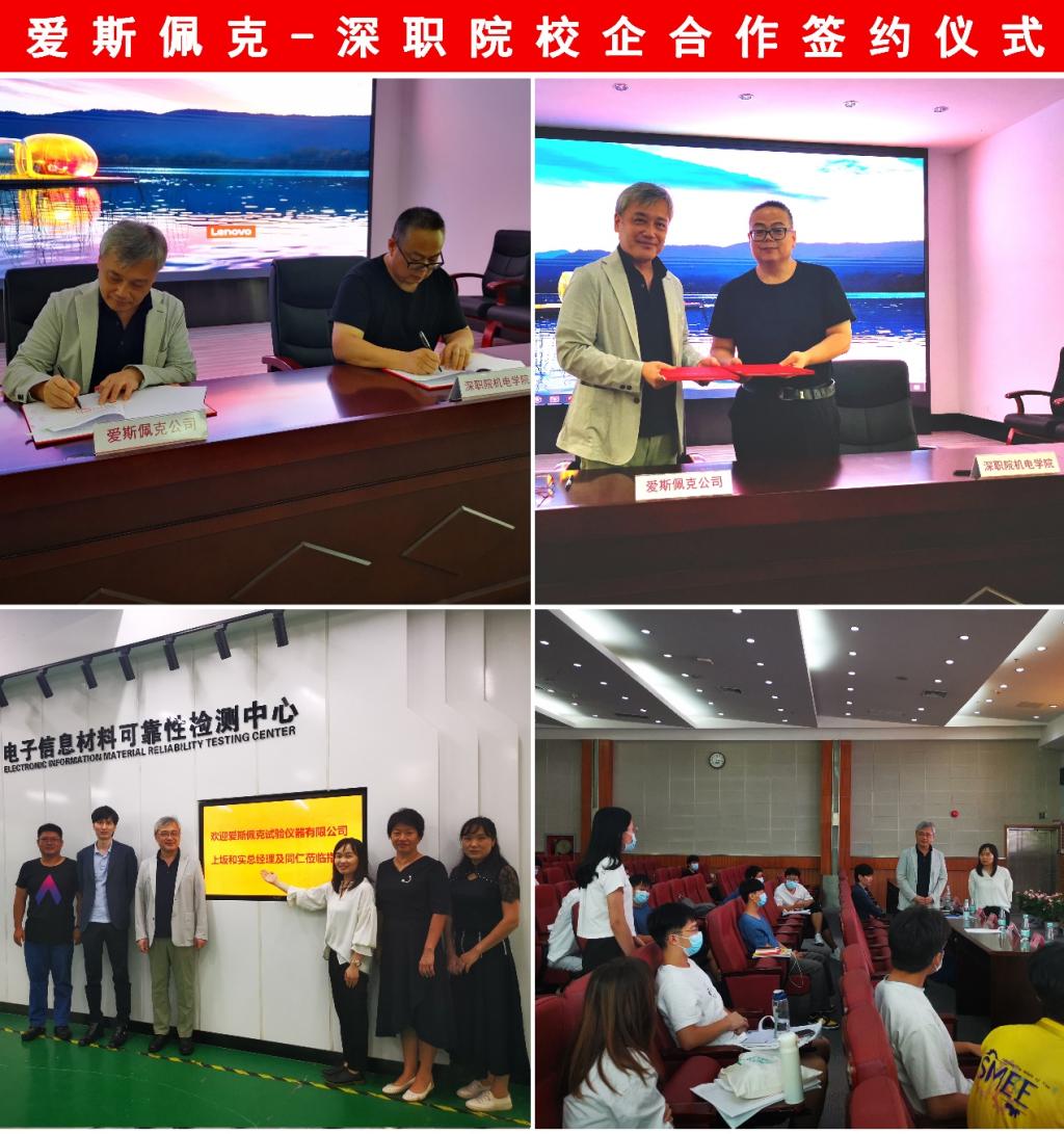 9月16日,爱斯佩克试验仪器(广东)有限公司总经理上坂和实和开发设计部总监村上元气等一行4人到访我校,在西丽湖校区图书馆西厅举行了隆重的签约仪式。机电学院副院长廖强华和总经理上坂和实分别发表了热情洋溢的致辞,双方表达了校企联合培养学生的美好愿景。两位领导完成了合作协议的签约,代表着双方合作进入了新阶段。爱斯佩克公司对我校人才培养,给予肯定和关注,表达了欢迎学校学生未来到其公司就业,与会学生代表踊跃发言,现场气氛十分活跃。会后,上板和实一行参观了机电学院的电子信息材料可靠性检测中心。