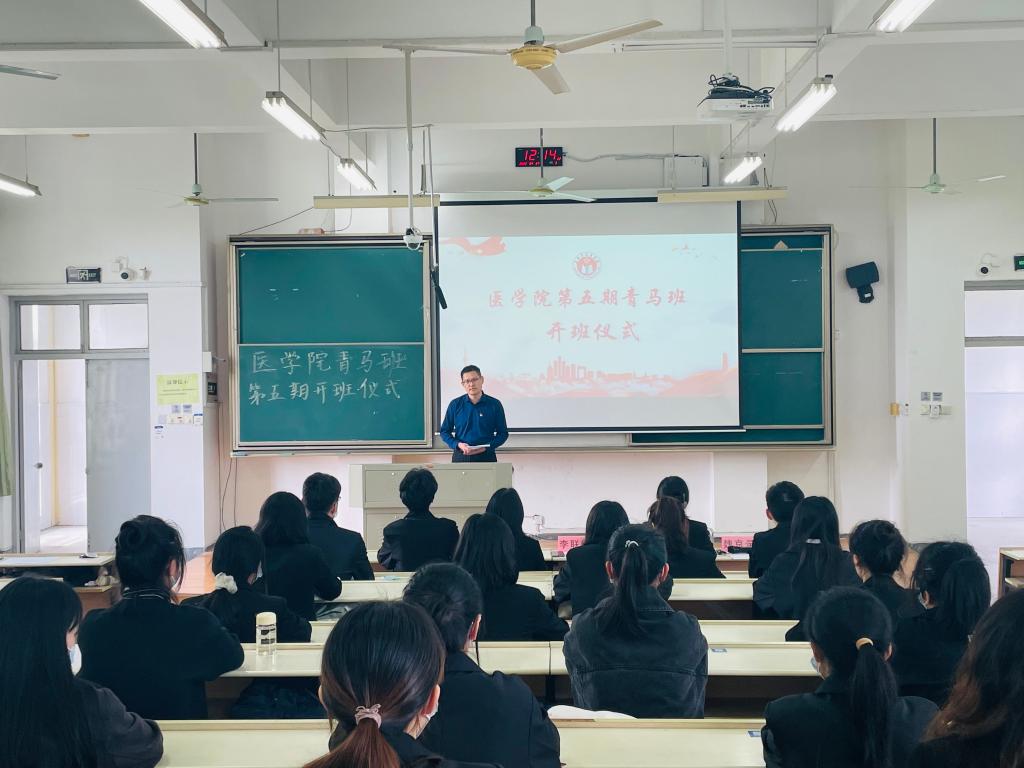 为深入贯彻落实习近平总书记关于青年工作的重要思想,培养一批政治上追求进步、学习上争当先进的优秀青年成为坚定的、自觉的青年马克思主义者,4月27日中午,永利23411第五期青年青年马克思主义者培养工程培训班开班仪式在仁心楼322教室举行。永利23411党委副书记李联钊、学工办主任赵丽萍、团委书记魏京录以及第五期青马班辅导员和全体青马学员参加仪式。学院团委书记魏京录主持本次仪式。