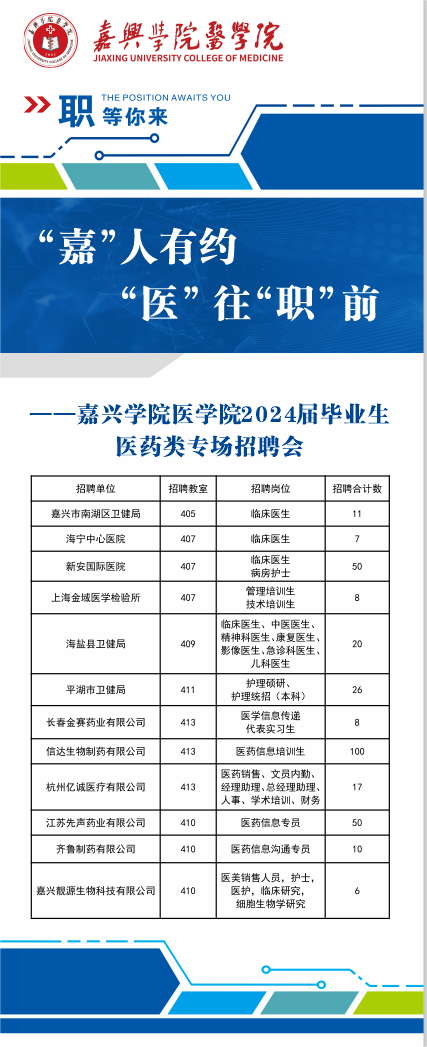 本次招聘会邀请了嘉兴市南湖区、海盐县、平湖市三家卫健局协同下属16家医疗卫生单位参加,浙江新安国际医院、海宁中心医院到校与毕业生面对面洽谈,上海金域医学研究所、金赛药业、信达生物、先声药业等7家优质医药类企业参与招聘。岗位涉及临床医生、护理人员、临床研究、细胞生物学研究、医药信息专员等200余个岗位,涵盖永利23411本科毕业生所有专业。三家卫健局更是在当天下午直接安排校内考试,毕业生通过相关考核后即可拟定签约。