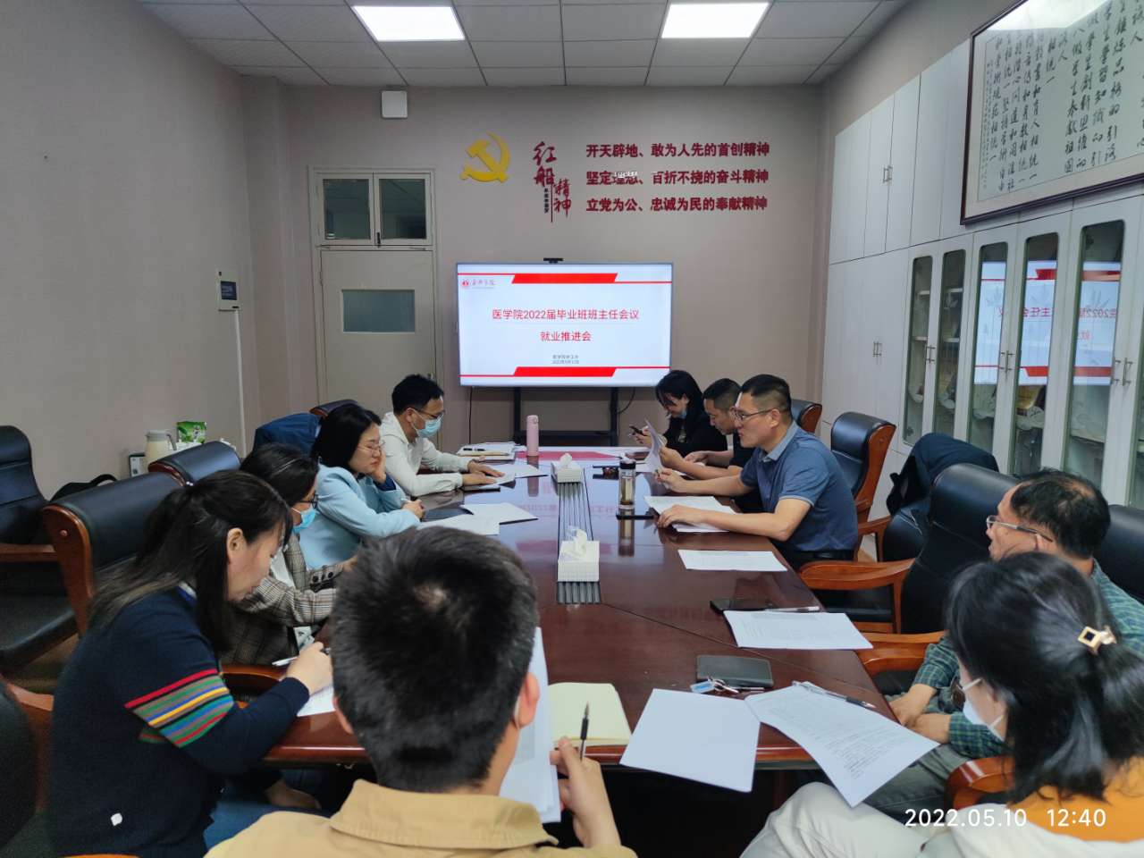 5月10日中午,永利23411召开第二次2022届毕业生就业工作推进会。学院党委副书记李联钊、学工办主任赵丽萍、就业辅导员袁佳艳及2022届毕业班班主任参加会议。