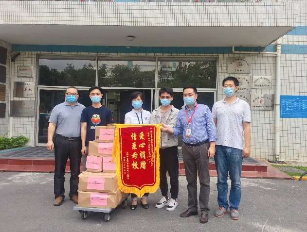 2021年3月27日下午机电工程学院于西丽湖校区实训楼下举行“爱心捐赠,情系母校”的校友捐赠活动。机电学院2018届校友卓海培先生将10箱180瓶500ml医用酒精,50瓶100ml免洗喷雾消毒液等物资捐赠给母校,用拳拳真心表达着对学院和母校的牵挂,为母校疫情防控贡献自己的力量。捐款活动恰逢我校党委书记、校长杨欣斌来机电学院实训室调研,他对卓海培的爱心捐赠表示感谢,赞赏他不忘师恩,心系母校,有情、有爱、有担当。杨书记还亲切地了解了卓海培校友创业情况,并祝福他把企业做得越来越好。卓海培校友对杨书记的祝福表示感谢,他表示自己在校期间得到了学校与老师们的关心与帮助,现在仅以微薄之力表达自己对母校培养的感激之情,同时,自己会进一步努力,进一步加强学习,把企业做大做好,不辜负书记的期望。